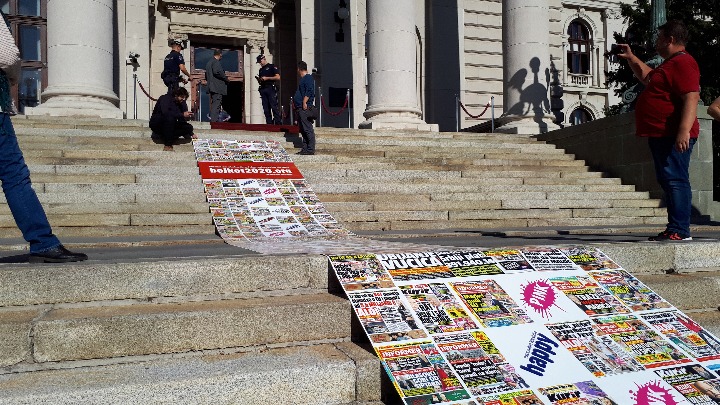 Inicijativa "Ne davimo Beograd" danas je ispred Doma Narodne skupštine umesto crvenog tepiha razvila, kako su ga nazvali, "tepih laži, podmetačina i blaćenja", na kojem su naslovne strane domaćih tabloida.
