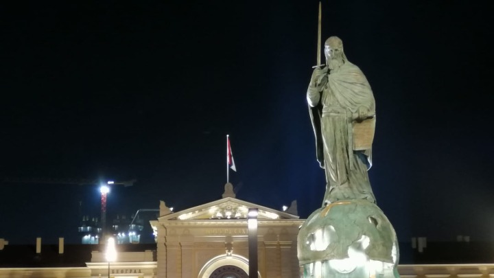I tako je pre par dana u prestonici, poput nekog supermarketa, svečano otvoren, spomkenik Stefanu Nemanji – za javnost. Skupilo se mnogo sveta, skupilo se državno rukovodstvo. Narod oduševljen, kažu da onako nešto nikad nisu videli. Svi zajedno deluju tako siromašno da nema autobusa koje plaća jedna stranka, oni ne bi imali novca da idu i vide bilo šta van svojih malih gradova, varošica i sela. Ali kažu veličanstven je spomenik. Državno rukovodstvo pak, koristi svoj trenutak za medijsku promociju: istorijska ličnost Aleksandar Vučić otvara spomenik istorijskoj ličnosti - Stefanu Nemanji. Definitivno jedan istorijski momenat, jedan istorijski događaj.
