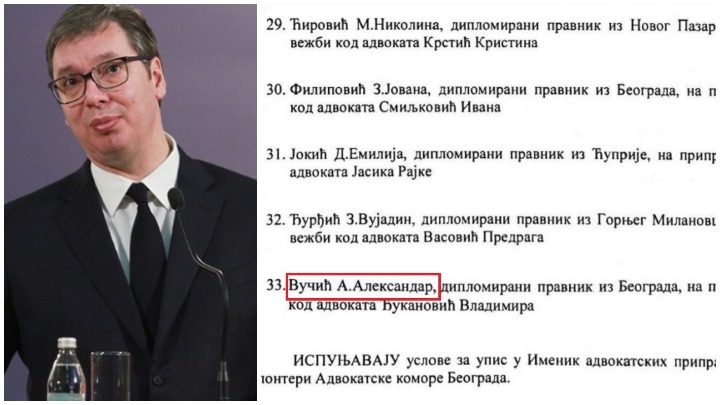 Nedavno je do mene dospela kopija ovog spiska. Oči moje, stare varalice, kao i obično kad se čovek ovde nađe u teškoj neverici, najlakše je da krene desetercem. Menjala sam naočare, ali redni broj 33. na listi advokatskih pripravnika volontera pri Advokatskoj komori Beograda stalno je ostajao isti: Vučić A. Aleksandar, diplomirani pravnik iz Beograda, na pripravničkoj vežbi kod advokata Đukanović Vladimira.
