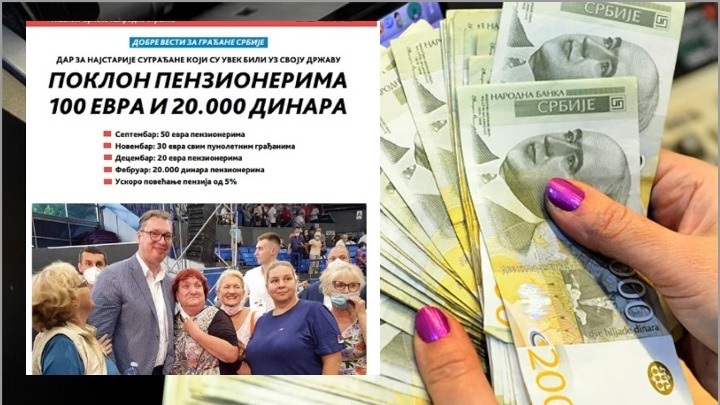 Obećao je po dvadeset hiljada. To je najveća suma koja je do sada obećana, ali će biti isplaćena u za Njega najpovoljnijem terminu, naravno, pred izbore. Pored toga obećano je još po 30 pa odmah posle toga po 20 evra, nešto svima a nešto samo penzionerima.