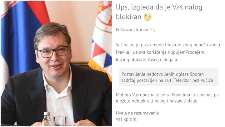 - Obrisali su mi oglas "Televizor bez Vučića" koji je bio u skladu sa pravilima i uslovima korišćenja propisanim od stranice "Kupujem prodajem". Obrisali su ga bez razloga. Pa sam odlučio da ga ponovo postavim sa drugim nazivom jer se izgleda nekome nije svideo. Oglas je postavljen sa namerom da se proda. Moj način prodaje je taj da proizvod predstavim na drugačiji, zanimljiv način - rekao je za Direktno.rs vlasnik televizora.