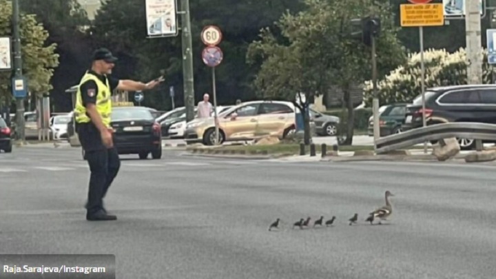 Naime, jedan prolaznik je u Sarajevu zabeležio trenutak u kojem je policajac zaustavio saobraćaj, kako bi patka i pačići sigurno prešli na drugu stranu ulice.