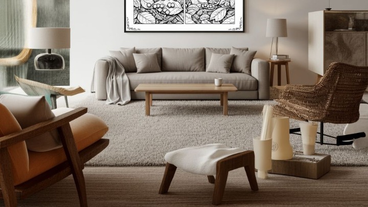 Tepih ispod garniture ili troseda uokviruje prostor i vizuelno ga razdvaja od ostatka sobe. Dodajte i par dekorativnih detalja: vaza, knjige ili umetnički print na zidu mogu naglasiti lični stil bez preterivanja.