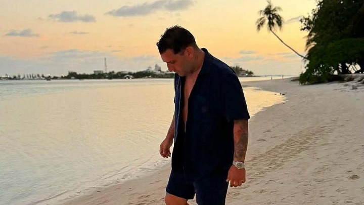 Tetovaže u prvom planu i širok osmeh jasno pokazuju da mu morski vazduh i te kako prijaju. Najemotivniji trenutak zabeležen je na plaži, gde sa suprugom pozira zagrljen, dok ona u naručju drži malu Srnu.