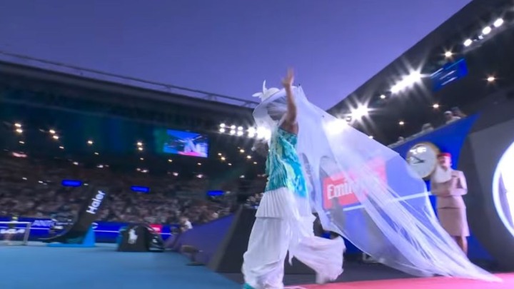 Japanka je teren "Rod Lejver arene" izašla tako što je nosila beli šešir širokog oboda i držala beli kišobran.