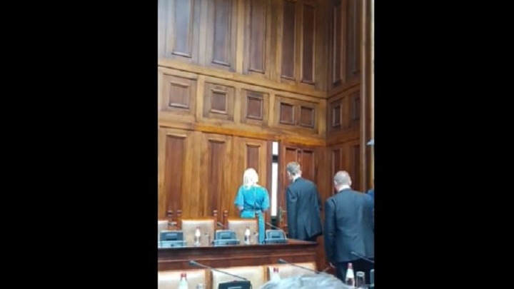 Nakon zahteva dela opozicije, ministar državne uprave i lokalne samouprave Aleksandar Martinović napustio je salu Narodne skupštine, što su opozicionari propratili pesmom "A sad adio".