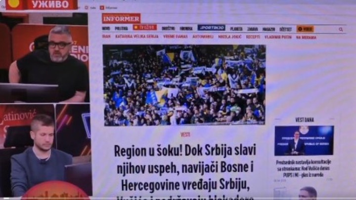 Vučićević je tako dobio "inspiraciju" tokom Kolegijuma, emisije na televiziji Informer. Komentarisao je tekst na sajtu ovog režimskog medija, čiji je naslov bio: "Region u šoku! Dok Srbija slavi njihov uspeh, navijači Bosne i Hercegovine vređaju Srbiju, Vučića i podržavaju blokadere".