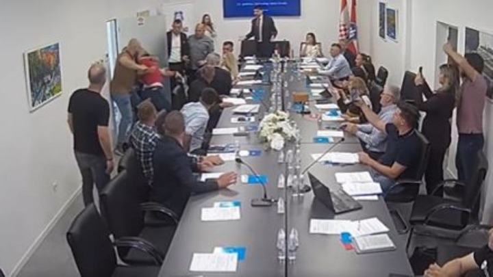 Kako se vidi na snimku prenosa uživo, odbornike je iznenadila glasna rasprava na ulazu u salu, koja je ubrzo prerasla u fizičko naguravanje.