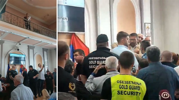 Privatno obezbeđenje, kako javlja reporterka Nove, bez legitimacije formiralo je kordon oko govornice, a došlo je i do rasprave između opozicionih odbornika i privatnog obezbeđenja.