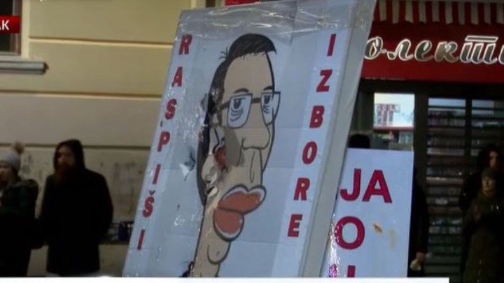 Građani su na kartonu nacrtali predsednika Srbije Aleksandra Vučića, sa kokošjim nogama, a pored njega je pisalo "raspiši izbore".